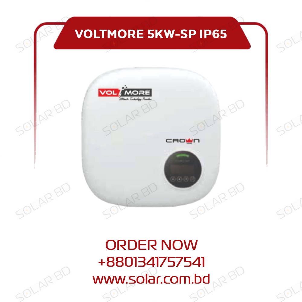 The Crown Micro VOLTMORE-VMGI-5KW-SP is a high-performance single-phase on-grid solar inverter designed for residential and small commercial solar systems. Delivering peak efficiency of 98.3% and Euro efficiency of 97.9%, it ensures maximum energy conversion and reliable long-term use. With an IP65-rated enclosure and optional Wi-Fi/4G communication, it provides both durability and smart monitoring features.