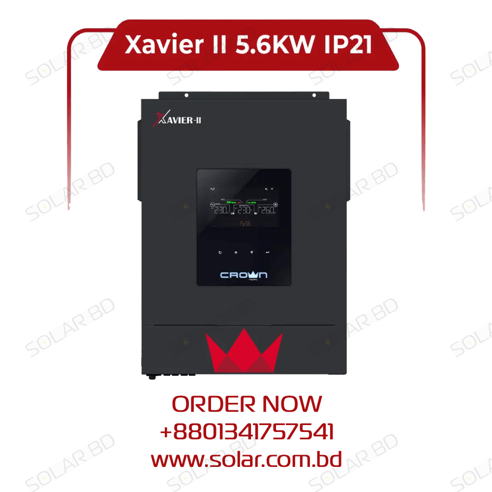 The Crown Xavier-II 5.6KW 48V 6000W inverter is a pure sine wave MPPT solar inverter designed for reliable off-grid and hybrid applications. With high efficiency of up to 93%, a wide PV input range (60–450VDC), and support for up to 6000W PV array, it ensures stable power for both residential and commercial use. The built-in 120A MPPT solar charger, dual output for smart load management, and feed-in to grid function make it versatile and future-ready.