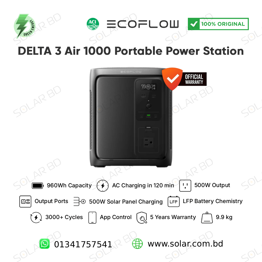 The EcoFlow DELTA 3 Air 1000 Portable Power Station is a high-capacity and efficient portable energy solution designed for home backup, outdoor use, and emergency power needs. Featuring a 960Wh LiFePO4 battery and 500W AC output with surge capability up to 1000W, this power station ensures stable and reliable performance for a wide range of devices. With fast AC charging that reaches full capacity in around 120 minutes and smart app control via Wi-Fi and Bluetooth, it delivers both convenience and control. Built with advanced LFP battery chemistry, the EcoFlow DELTA 3 Air 1000 Portable Power Station offers enhanced safety, durability, and long-lasting performance for everyday and off-grid applications.