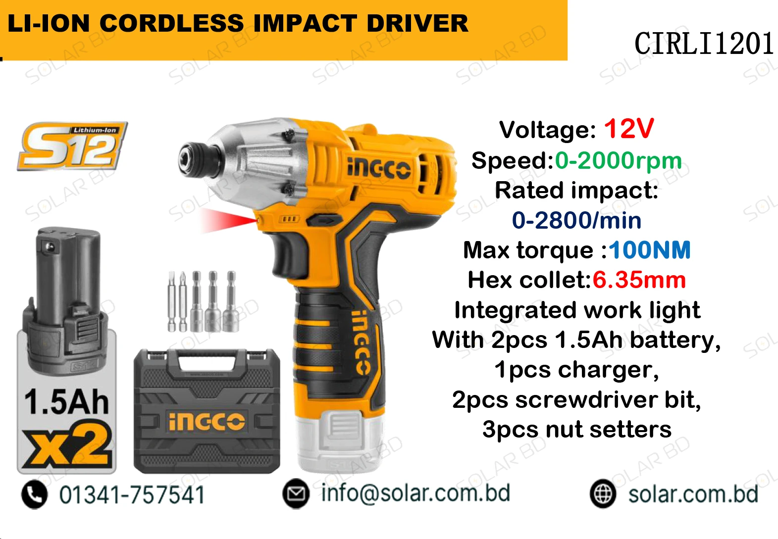 INGCO 12V cordless impact driver, INGCO impact driver dual battery, 12V impact driver Bangladesh, cordless impact driver 2 battery, INGCO power tools BD, lithium-ion impact driver, professional impact driver, portable impact driver, LED work light impact driver, dual battery screwdriver, INGCO CIRLI1201, battery powered impact driver, cordless screwdriver impact driver, home repair impact driver, furniture assembly driver, solar installation tool, electrical installation impact driver, workshop impact driver, DIY impact driver Bangladesh, heavy duty cordless impact driver
