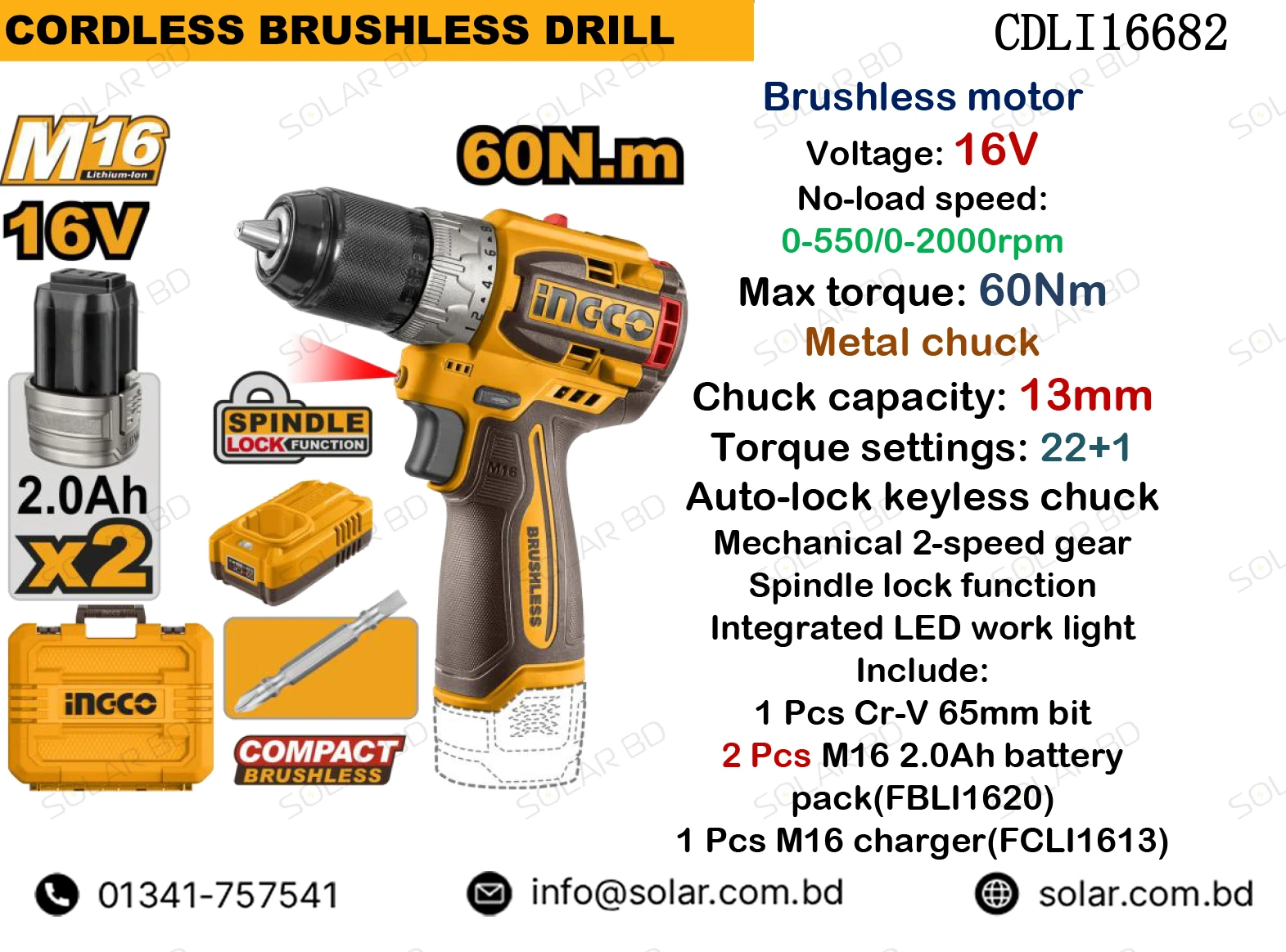 The INGCO 16V cordless drill is equipped with a brushless motor, which provides several advantages over traditional brushed motors: