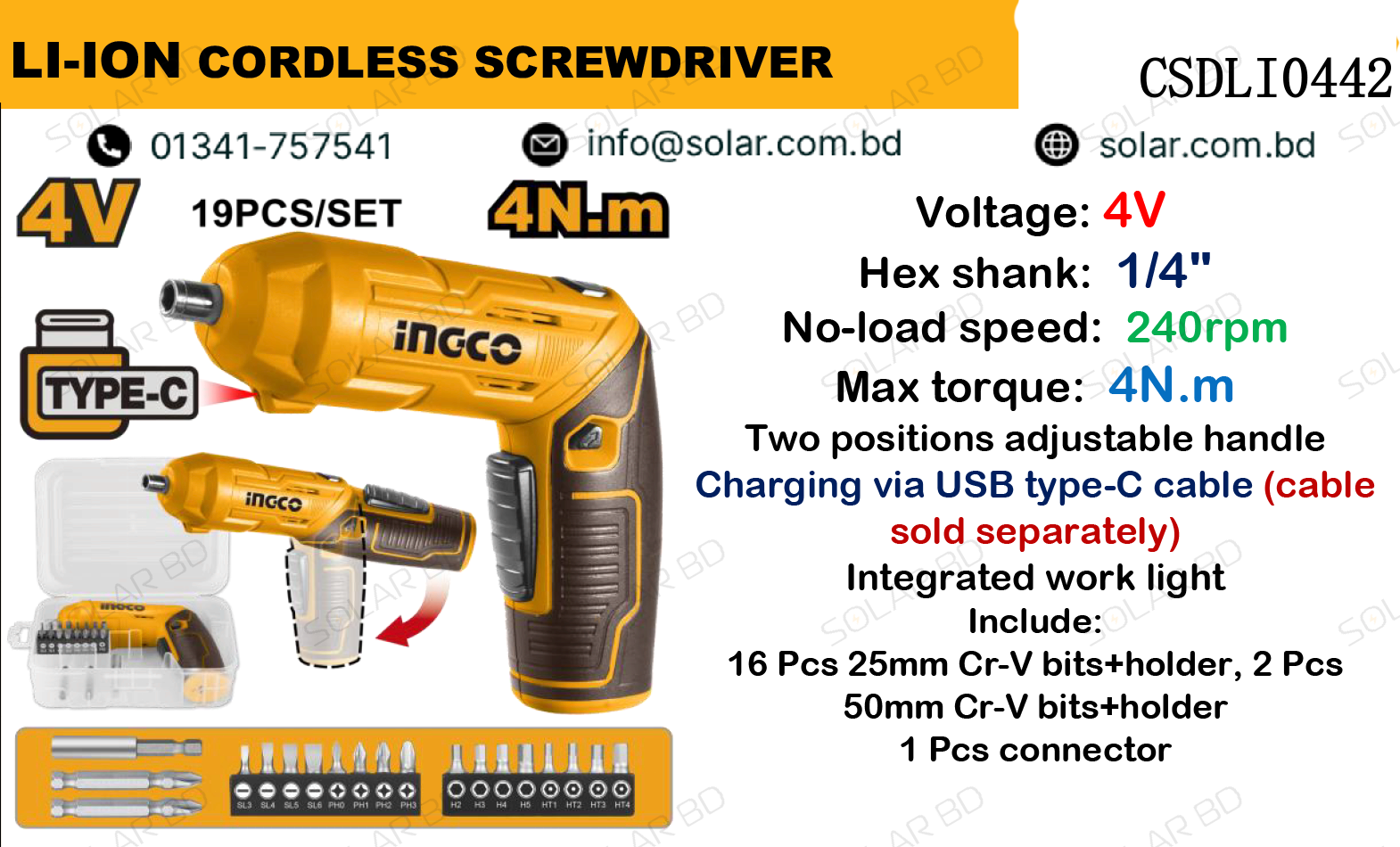 INGCO 4V Lithium-Ion Cordless Screwdriver (CSDLI0442) – Smart, Compact & Reliable for Everyday Work in Bangladesh