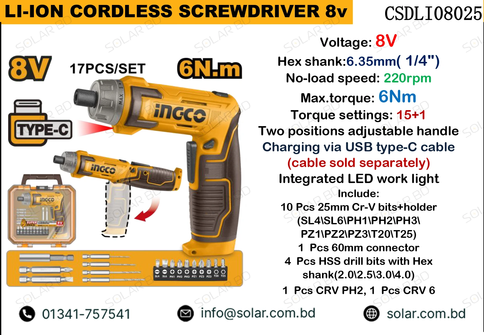 With rising demand for solar systems, home improvement, and electrical services in Bangladesh, the INGCO 8V Cordless Screwdriver 1.5Ah meets the needs of a growing market. Its low power consumption, rechargeable battery, and portable design make it suitable for both urban and rural environments. It is an ideal tool for professionals who need dependable performance and for homeowners who want a practical solution for everyday repairs.