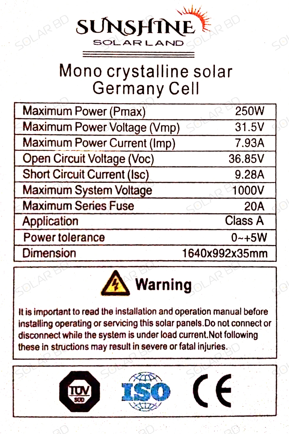| Maximum Power (Pmax) | 250W |