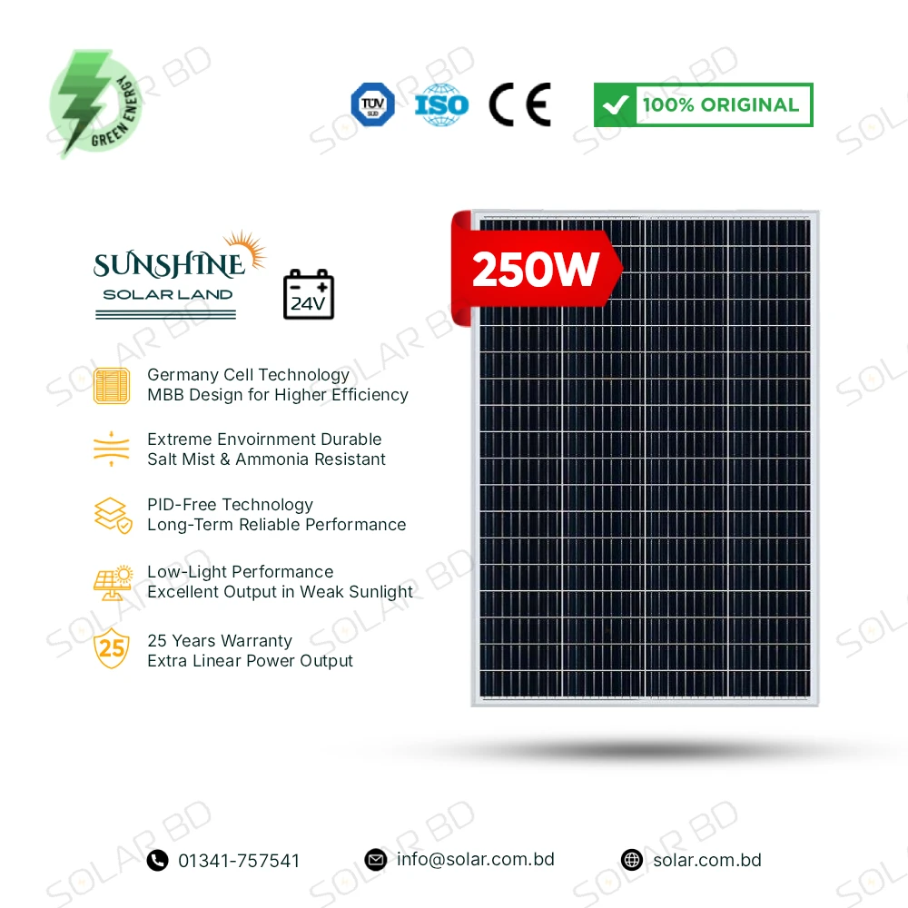 The SUNSHINE 250W Germany Cell 24V Mono Solar Panel is a high-efficiency solar module designed for modern off-grid solar systems. Built with advanced Germany cell technology and bifacial power generation capability, this panel can capture sunlight from both the front and rear sides to maximize energy production.