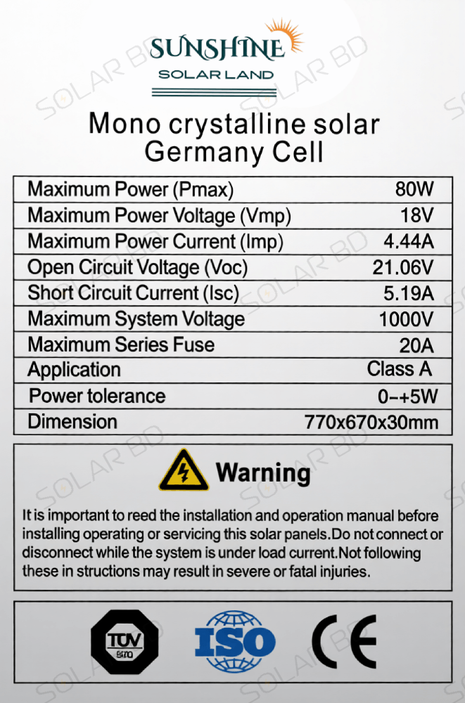 The SUNSHINE 80W Germany Cell 12V Mono Solar Panel is a compact and reliable solar module designed for small off-grid solar systems. Built using high-quality Germany cell technology and modern MBB (Multi Busbar) design, this solar panel delivers stable energy output and improved efficiency even in challenging environmental conditions.